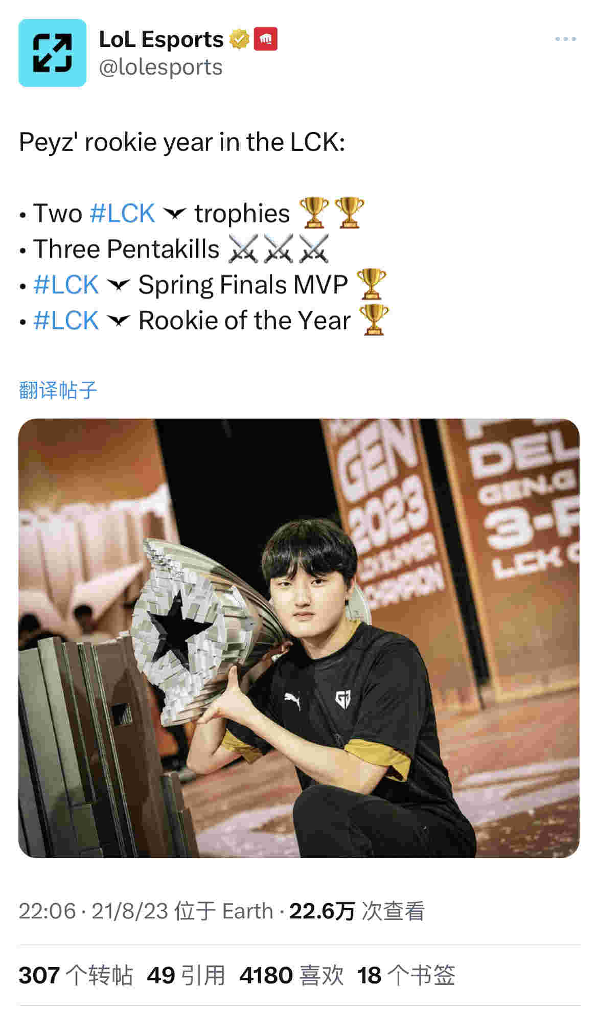 LOL ESPORTS今日更新了一条关于GEN的AD选手PEYZ的推特: