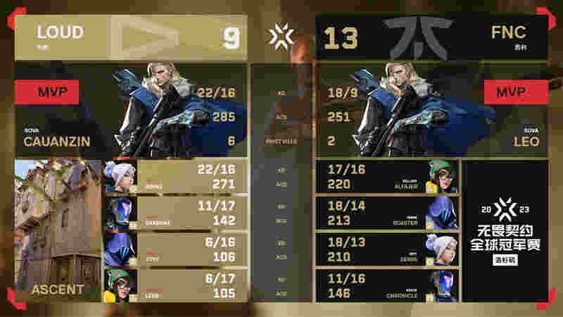 本张地图FNC 13:9 LOUD,MVP给到了Leo选手。