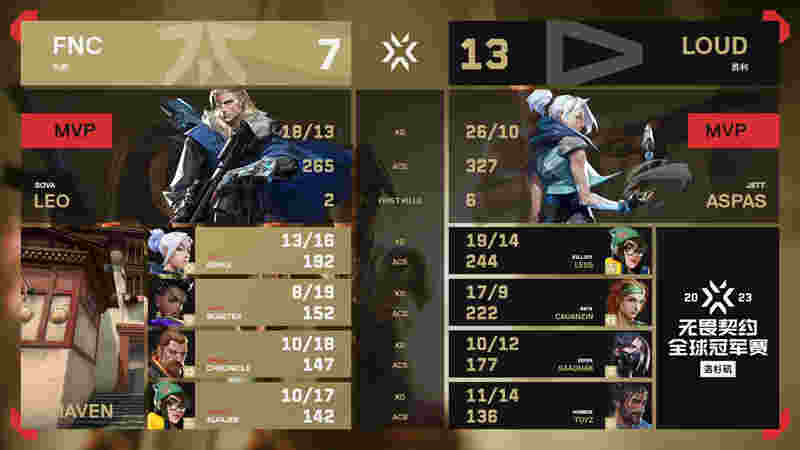 本张地图FNC 7:13 LOUD,MVP给到了aspas选手。