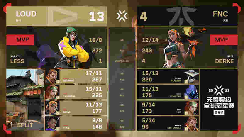 本张地图FNC 4:13 LOUD,MVP给到了Less选手。
