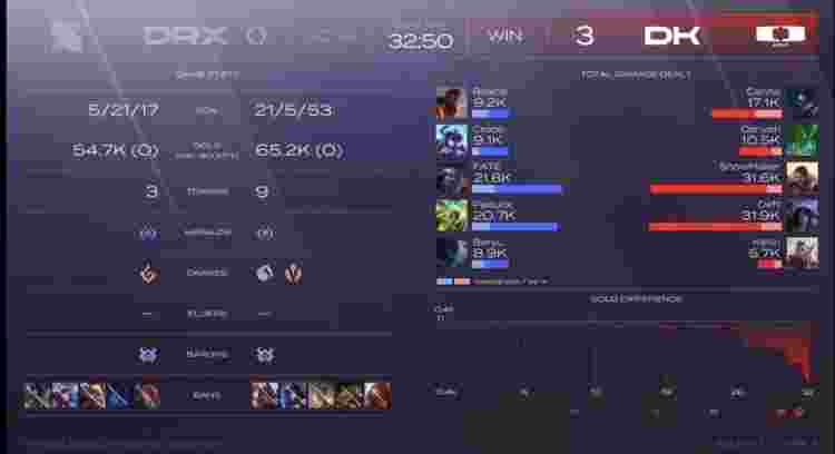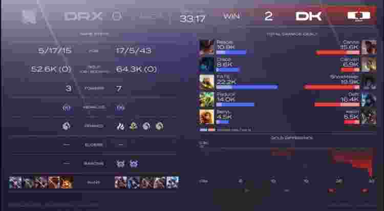 第17分钟,DK拿二先锋,侧翼BeryL牛头二连逼出Deft霞大招,Canna鳄鱼复活TP落地配合Canyon芮尔吸两个,ShowMaker塞拉斯偷到牛头大进场瞬间融化了DRX的前排!ShowMaker塞拉斯后续团战单防Paduck泽丽,Deft霞三杀收尾,DK打出0换4!