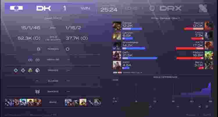 24分钟,小龙团Canna鳄鱼找人被开金身拖时间,DK支援赶到,Kellin洛配合偷大树大的ShowMaker塞拉斯进场留人,DRX多人残血只能边打边撤,但是Paduck泽丽哪怕是爆闪打输出了也还是在刮痧啊!DK这波下路团战甚至是四打五送了DRX一个团灭!随后DK直接一波结束首局!双方击杀比15比1!