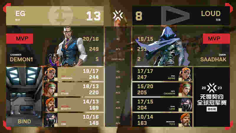 来到下半场EG 2-1开局,Demon1在第16回合起到冥驹,LOUD也是全员大枪,EG的A点防守通过技能的不断衔接给到LOUD压力,EG轻松拿下这一分。EG的状态越大越好,LOUD有些疲于进攻,EG率先拿到11分。LOUD在第19回合回防A点,拿到这一回合将比分缩小到3分的分差。第20回合LOUD强行打B,没有去骗取技能,被EG防守架住所有人,EG拿到赛点。第21回合赛点局,LOUD强进A点双方四人互相打掉,残局1V1LOUD转点B,被EG回防的更快架掉,EG挺进决赛。