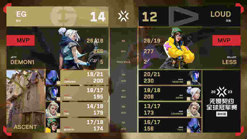 下半场,EG拿下手枪局之后,不断通过战术转换破解LOUD的进攻,比分迅速被拉开至10:6。LOUD经过短暂调整,凭借Less的奥丁不断穿射探点,EG的防守站位不得不被迫换点,比分一度被追至10:11。关键局Demon1在中路被击杀后,LOUD时间已经被拖了太久,爆能器没能及时放下,EG拿到赛点。随后LOUD在吃了时间的亏之后,尝试加快进攻节奏,下半场双方战至12平,比赛进入加时。