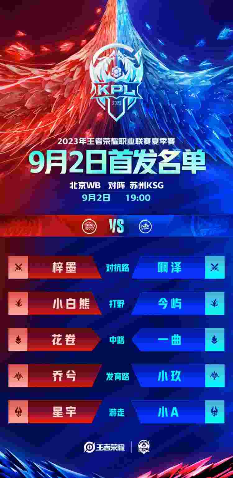 2023KPL夏季赛季后赛Day10将迎来败者组半决赛北京WB vs 苏州KSG的比赛,赛前KPL赛事官方公布两队首发以及解说主持阵容。