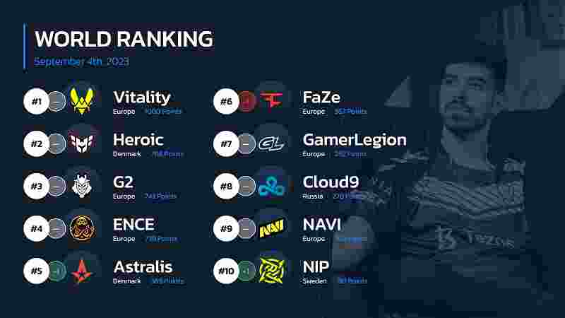 Astralis所代替,这也是后者自2022年9月以来首次回归Top5。