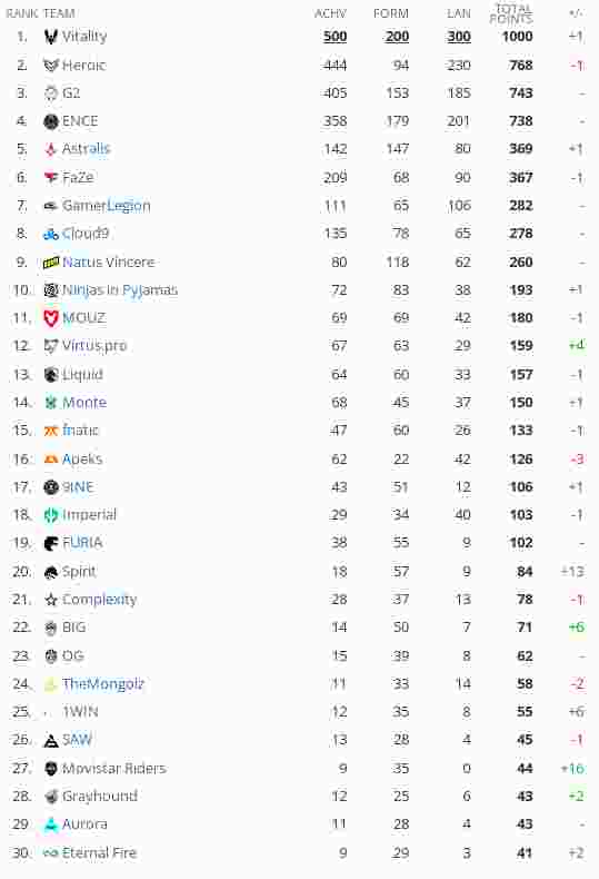 对于首次阅读HLTV世界排名的CSer,需要先了解下HLTV的排名机制:HLTV排名体系基于战队过去一年的成绩(每个月积分衰减)、近两个月的表现以及在近三个月赛事中的发挥。
