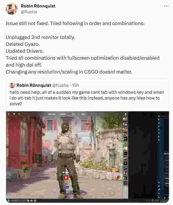 Robin Rönnquist | flusha在推特发文求助,他想使用Tab+Windows键切换CS2程序时突然出错切不了。