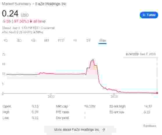 今年3月份,FaZe的股票价格为每股0.59元,自那之后FaZe的股价继续走低,如今只有0.24美元。FaZe的市值在半年中已经缩水一半以上。