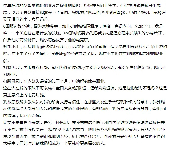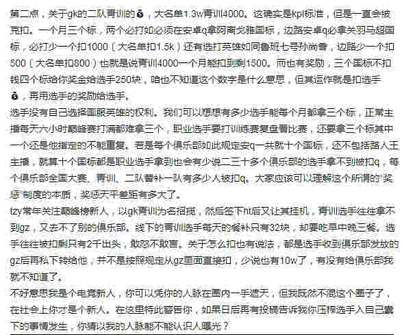 知情人士在贴吧爆料,佛山DRG青训教练子越一手遮天,以各种严苛的标准克扣青训选手的工资,从4000扣到1500。而且扣款不是从表面上扣的,都是选手收到俱乐部发放的工资后再私下转给子越,并不是按照规定直接从工资里扣,因此收到的工资看上去还是很多的。