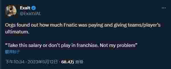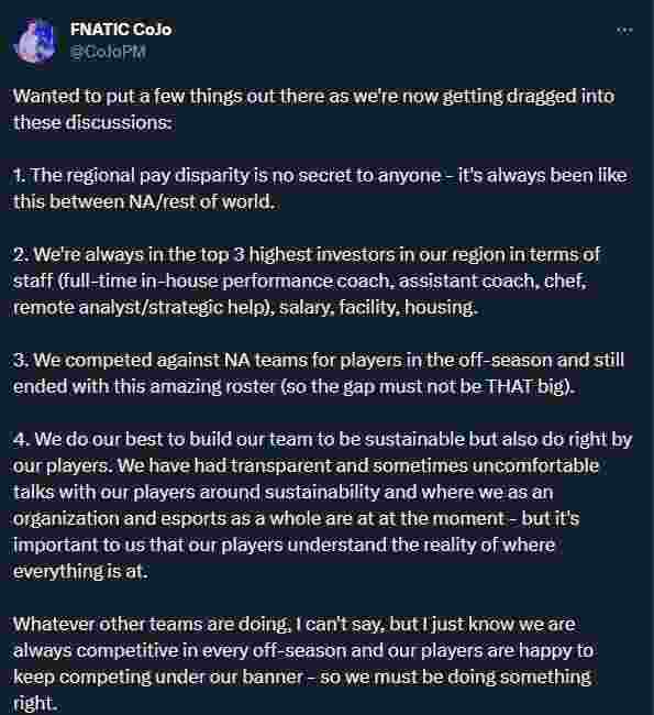 FNATIC的Cojo在回应Exalt有关Fnatic薪资的推文时表示,FNATIC目前是EMEA地区投资前三的俱乐部,选手乐于在我们旗下效力,压迫之谈纯属子虚乌有之言。