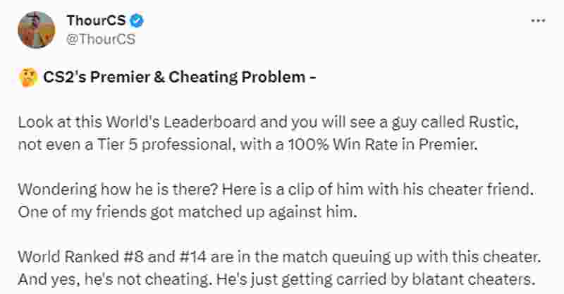 数据挖掘者ThourCS在个人推特上分享了一视频片段,内容是:现CS2全球积分榜上TOP 8,胜率达到100%,ID为“RUSTIC”的玩家和他的作弊队友一起上分。(注:该片段主要怀疑的是他队友作弊,并未指RUSTIC作弊),ThourCS借此指出CS2中的作弊问题。