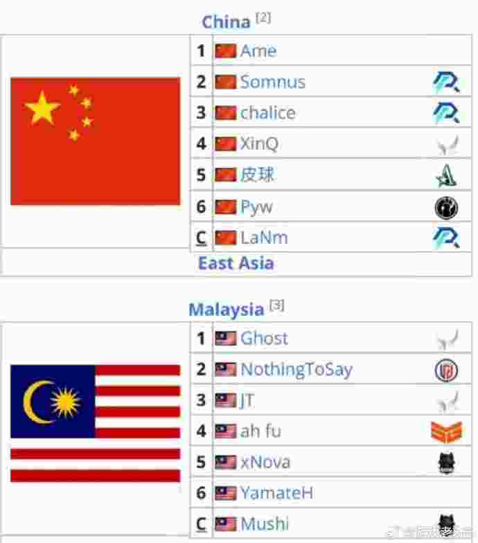 马来西亚阵容:一号位Ghost、二号位NothingToSay、三号位JT、四号位ahfu、五号位Xnova、替补Yamateh、教练Mushi。