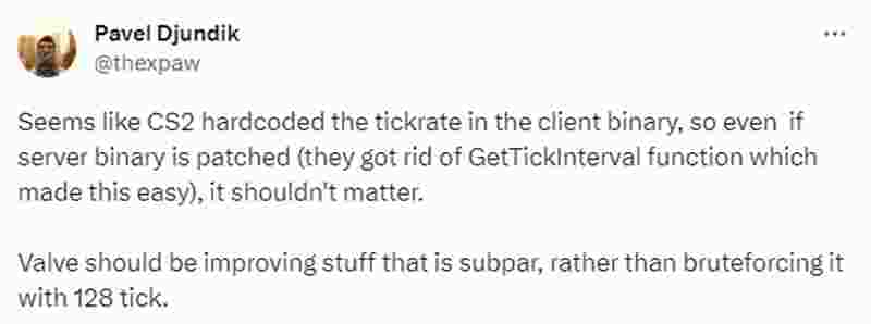 先前传言CS2的开发人员似乎在软件层面限制了创建tickrate为128的服务器的能力,迫使大家都接受subtick系统。