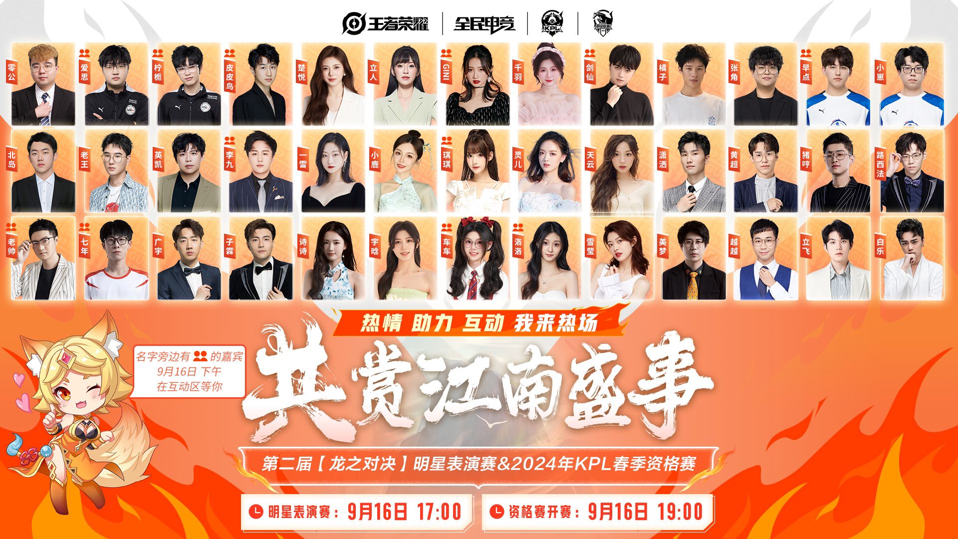 9月16日,14:30-16:30,明星嘉宾团BOA零公、上海EDGM爱思、上海EDGM柠栀、无敌皮皮鸟、解说楚悦、解说立人、吉尼Gini、解说千羽、剑仙、武汉eStar橘子、张角、LGDNBW-早点、LGDNBW-小崽、北岛、解说老王、解说英凯、解说李九、解说一雪、解说小鹿、解说琪琪、灵儿、解说天云、解说潇洒、GK黄色超人oye、PigHeng、YTG丶西法、王者荣耀七年QINIAN 、广宇、解说子霖、解说诗诗、解说宇晗、解说车车、解说洛洛、解说雪莹、解说美梦、解说越越、解说立飞、解说白乐、多位明星嘉宾前来热场;同时部分嘉宾将分为两组在互动区域等着小伙伴们的互动哦~
