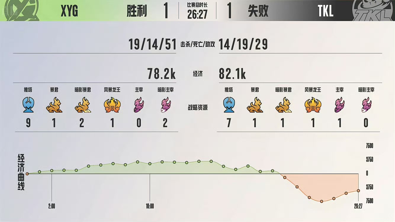 开局XYG中辅强势对线,XYG景诗 沈梦溪击杀不知火舞拿到一血。四分钟双方在龙坑处拉扯,TKL三藏 裴擒虎关键抢夺,TKL拿下第一条暴君,但XYG团战一换三,并推掉中路一塔。五分半,下路河道处爆发团战,XYG先击杀裴擒虎,但TKL情川 亚连赶来收下孙尚香,及时止损。XYG景晚 狂铁趁机推塔,将中路二塔点至丝血。八分半双方换龙,XYG拿到暴君,TKL拿到主宰。