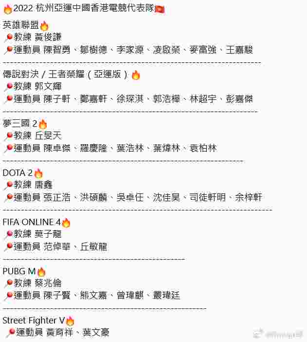 中国香港也参加了亚运电竞的七个项目,分别是英雄联盟、王者荣耀、梦三国、DOTA2、FIFA、PUBG、街头霸王。以下是2022杭州亚运会中国香港电竞代表队的选手阵容名单。