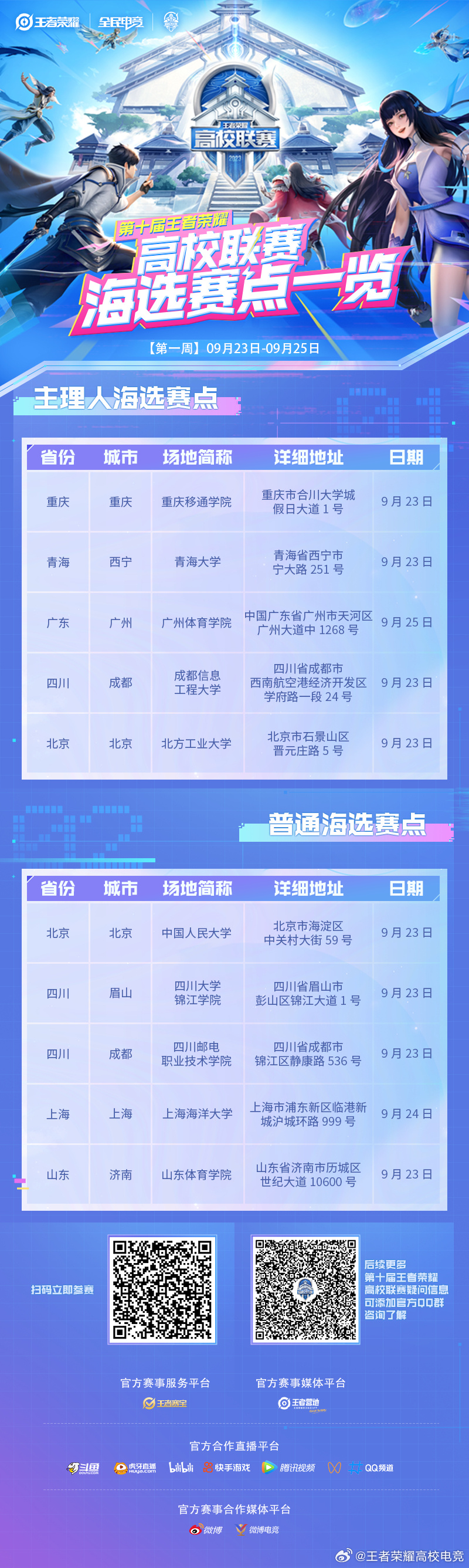 第十届王者荣耀高校联赛# 即将开赛,快来看看为大家准备的海选赛点一览图吧!
