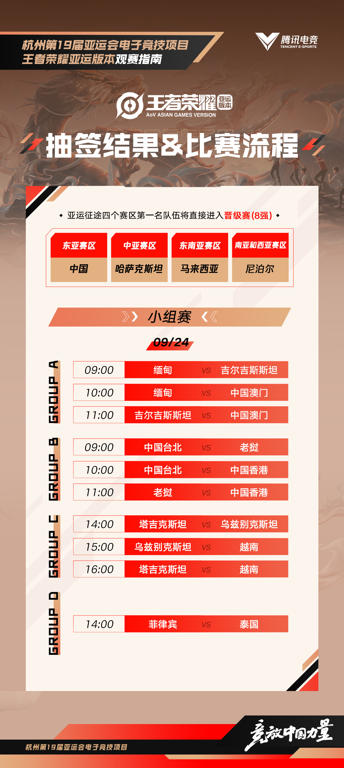 9月22日,杭州亚运会电子竞技项目王者荣耀亚运版本分组抽签结果公布!