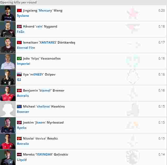 值得一提的是,在如今主流战术风格越来越保守的情况下,狙击手并不会是队伍中尝试首杀最多的人,往往突破手或者主点的CT是第一个和对手交火的人,这个榜单中有我们熟悉的突破手rain、XANTARES、jkaem、YEKINDAR,不过汉堡还是凭借自己精湛的枪法,和更多的首杀排到了榜单第一。