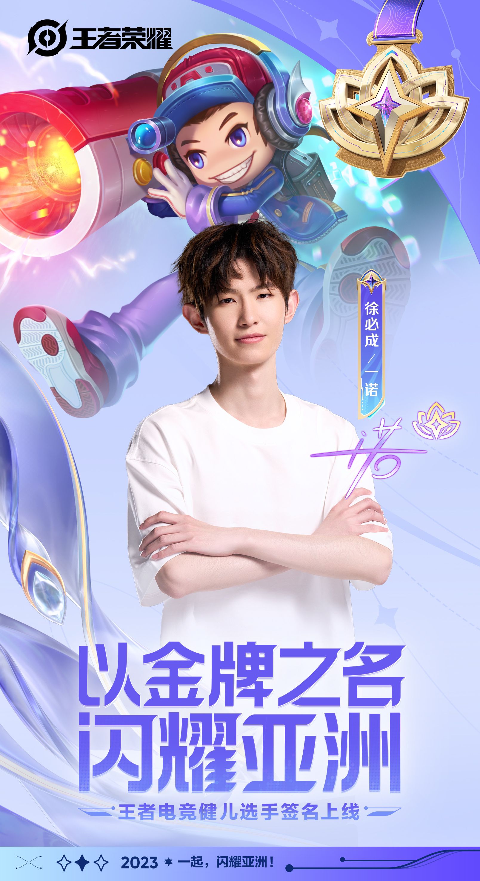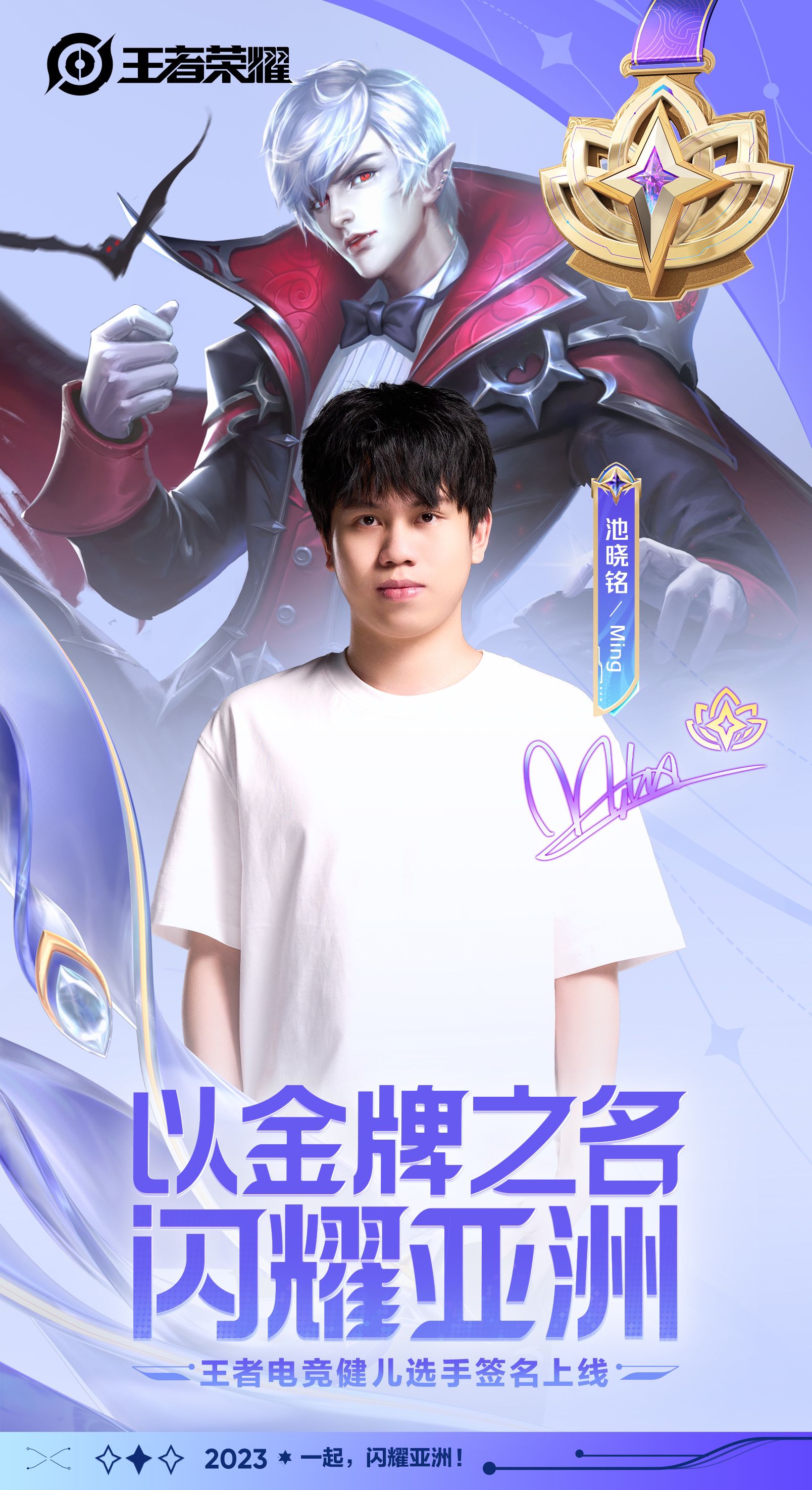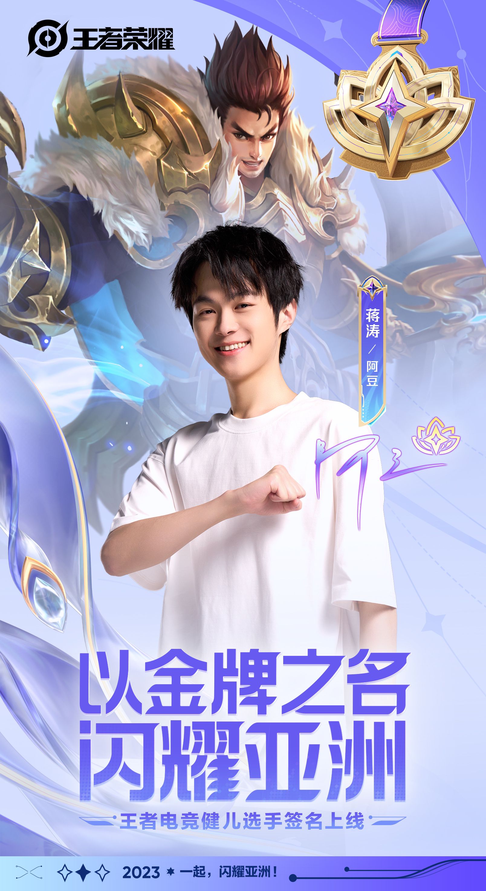 为恭喜广州TTG阿豆、eStarPro花海、上海EDGMMing 、北京WB暖阳、eStarPro坦然、AG一诺在杭州亚运会为电竞项目夺得首金,六款专属签名海报上线游戏,和王者电竞健儿一起同享荣耀 !