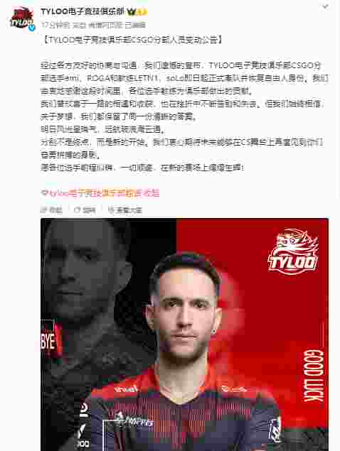 【TYLOO电子竞技俱乐部CSGO分部人员变动公告】