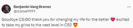 Benjamin Bremer | blameF:再见CSGO。谢谢你改变了我的生活,让它变得更好。很激动,希望能在CS2中不断磨练,让自己更上一层楼。