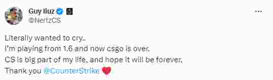 Guy Iluz | NertZ:只是单纯的想哭。我从CS 1.6开始打起,现在CSGO要结束了。CS是我生命的重要组成部分,希望它会成为永远。谢谢你CS。