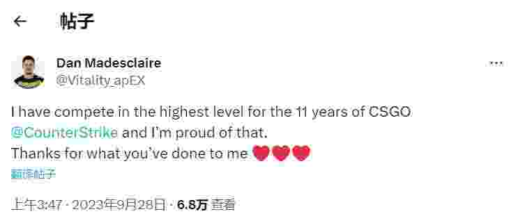 Dan Madesclaire | apEX:我在CSGO的顶级赛场征战11年,我对此深感自豪。谢谢你为我所做的一切。