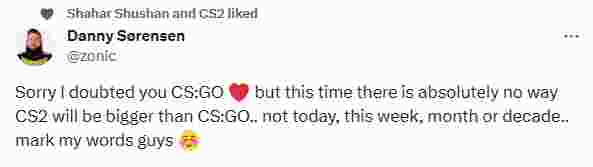 Danny Sørensen | zonic:对不起CSGO,我怀疑过你。但这次CS2不可能超越CSGO。今天、这周、这个月或这十年都不行。记住我的话。