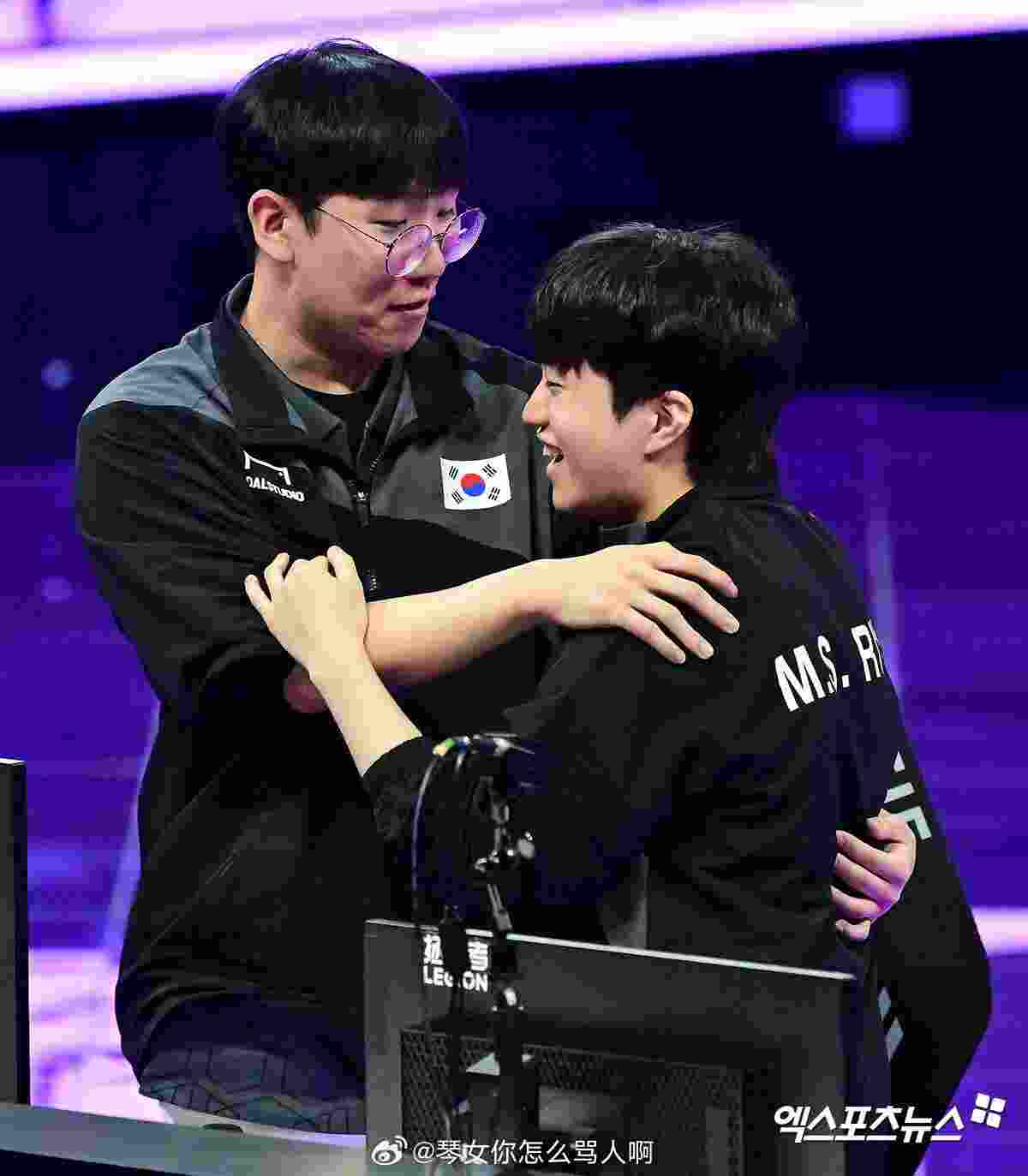 赛后来自T1俱乐部的韩国选手Zeus、Keria一直都跟着JDG俱乐部的Kanavi、Ruler选手。