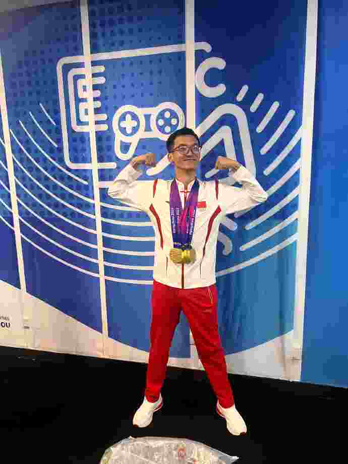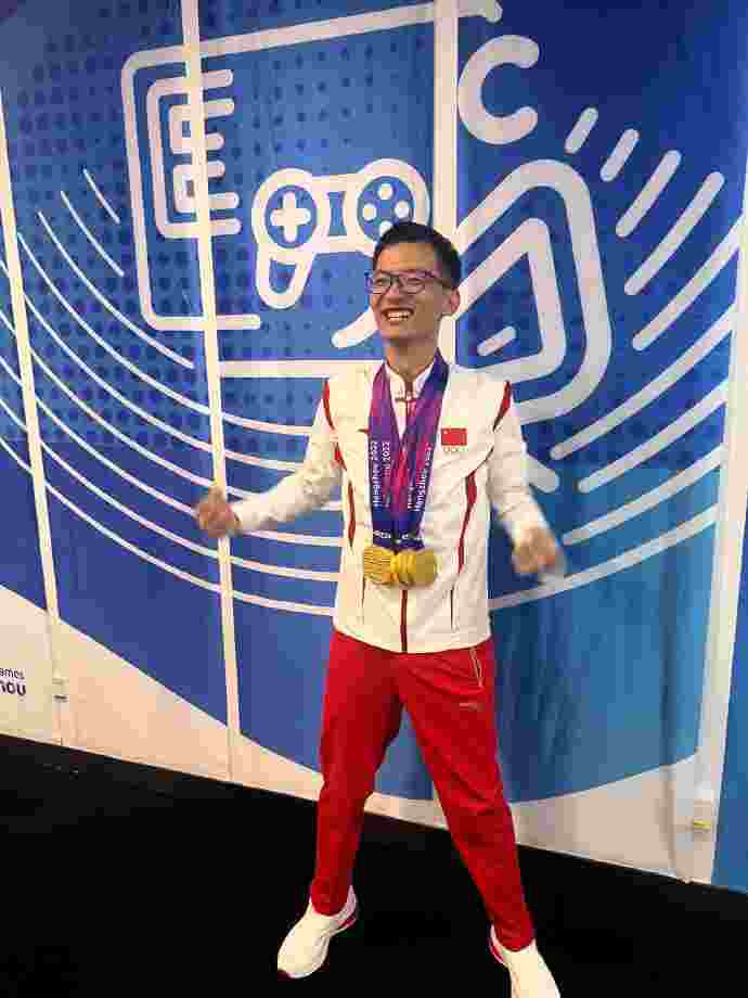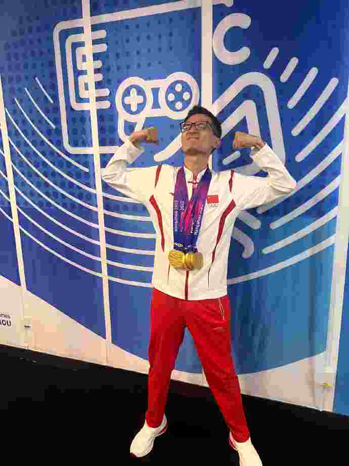 10月2日讯 杭州亚运会《DOTA2》项目决赛,中国队鏖战三局击败蒙古队夺得金牌。赛后DOTA2官方分享教练——国士无双戴多枚金牌返图。