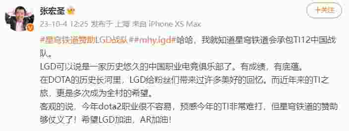 《崩坏:星穹铁道》将赞助LGD和AR战队出征本次TI12。张宏圣更新微博发表自己的看法,