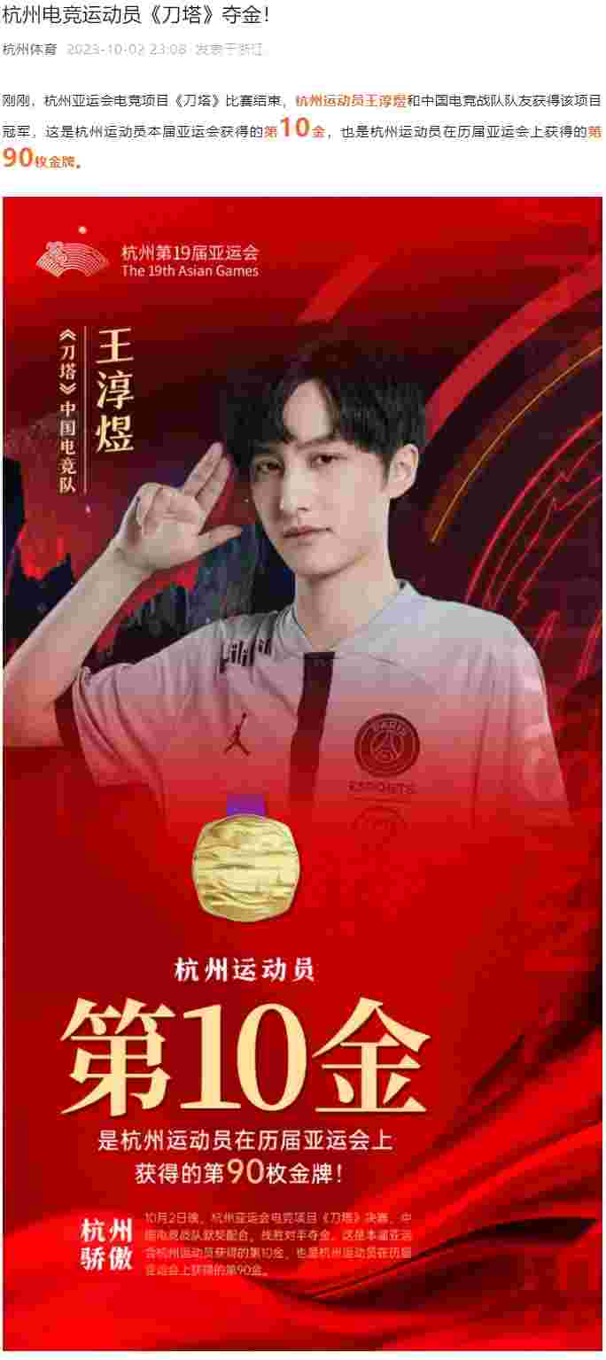 “杭州运动员王淳煜和中国电竞战队队友获得该项目冠军,这是杭州运动员本届亚运会获得的第10金,也是杭州运动员在历届亚运会上获得的第90枚金牌。”