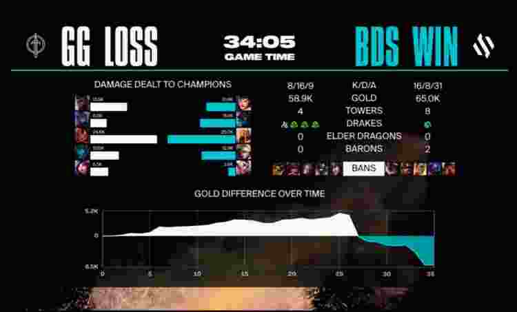 【33:01】BDS趁GG不注意再收大龙,中路妮蔻抽象开R被沙皇戳死,茂凯黏住奎桑提想留人但奎桑提反手将其击杀,BDS打出1换2中路推进拔掉GG水晶,盖伦闪现向前打残卡莉丝塔,BDS一波推平GG基地拿到赛点。