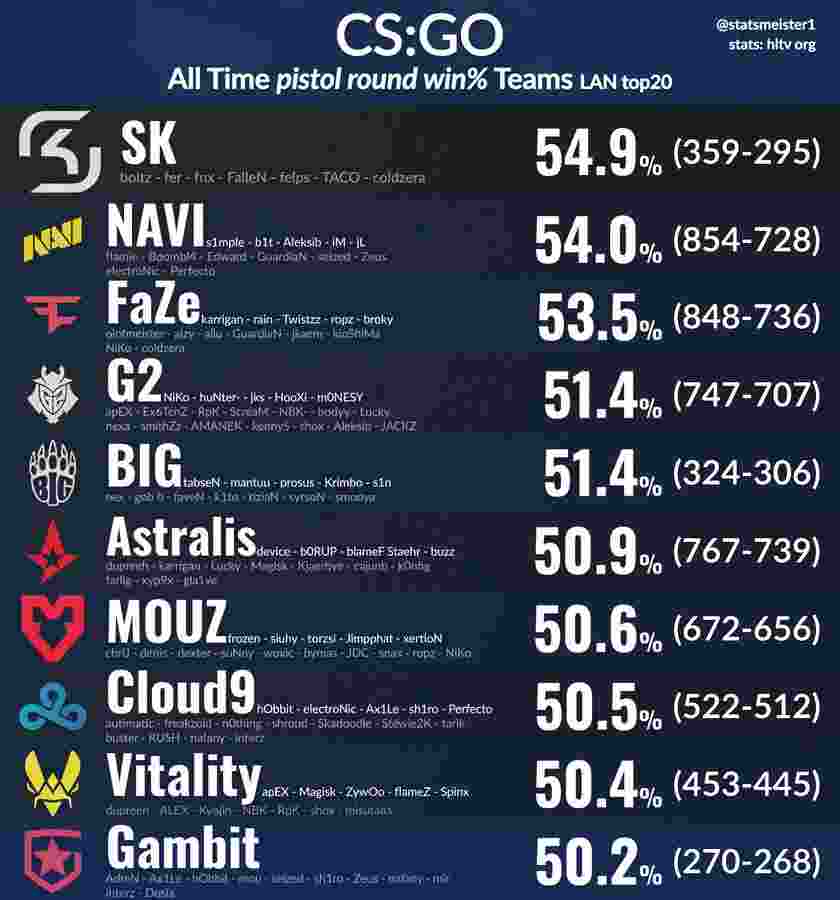 日前数据统计网站统计了CSGO时代线下赛中战队的手枪局胜率情况,其中