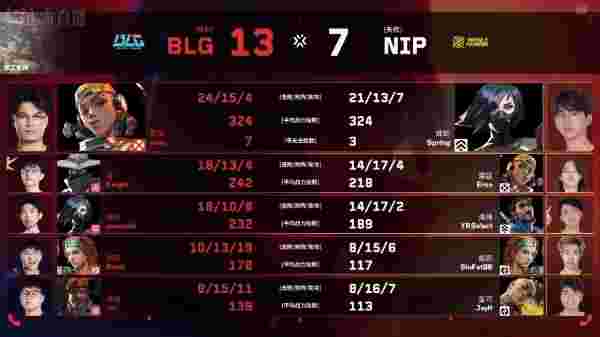 下半场手枪局,选择5人冲击A小的BLG在对方满技能的情况下显得软弱无力,NIP拿下手枪局。BLG的eco局,正义大队再度发挥,放空a小被对方顺利侵入的NIP被对方打出一波1换5,BLG成功翻盘!第十七回合,“幽默王哥”whzy进攻冥驹深入敌方腹地送出首杀,人数劣势的BLG再度抓到对方的防守薄弱点,A小四人摸排成功占领A点拿下关键局,比分11-6,BLG离赛点仅有一步之遥。在whzy“幽默冥驹”再度送出首杀的情况下,BLG的进攻略显停滞,NIP在spring和yrselect的双人五杀下拿下他们的第七分。第十九回合,梦泪老师,又是他,中路单摸拿三杀!BLG在Yosemite的完美发挥下顺利拿下赛点。最终BLG在biank的奥丁三杀下成功终结比赛,以13-8的比分拿下对方选图!