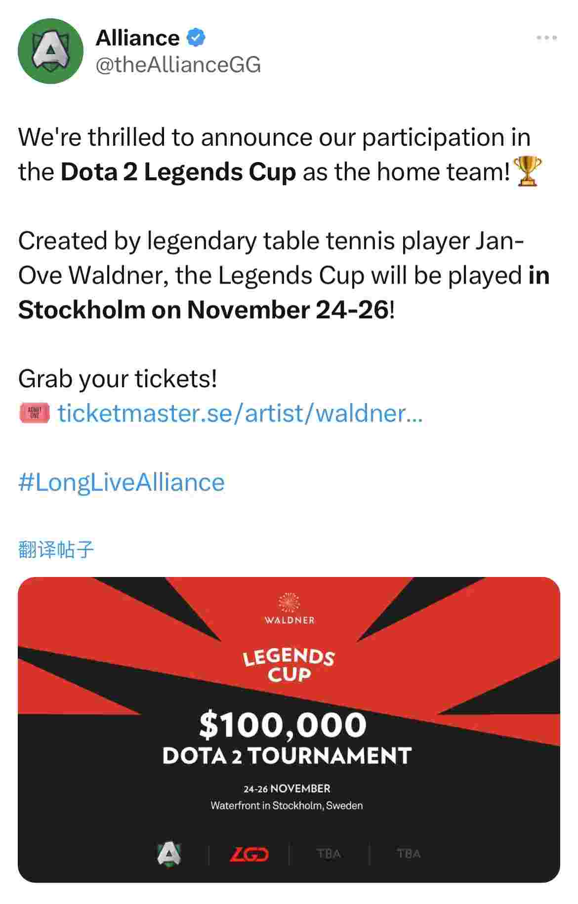 昨日,Alliance战队官方推特发布了一则新消息,由传奇乒乓球运动员Janove Waldner发起的DOTA2LegendsCup将于11月24日至11月26日在瑞典首都斯德哥尔摩举行,而Alliance将作为本土主队受邀参与这项赛事。