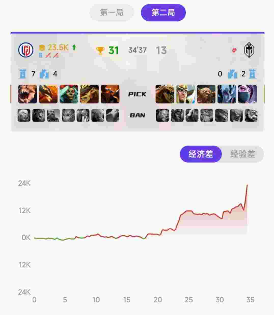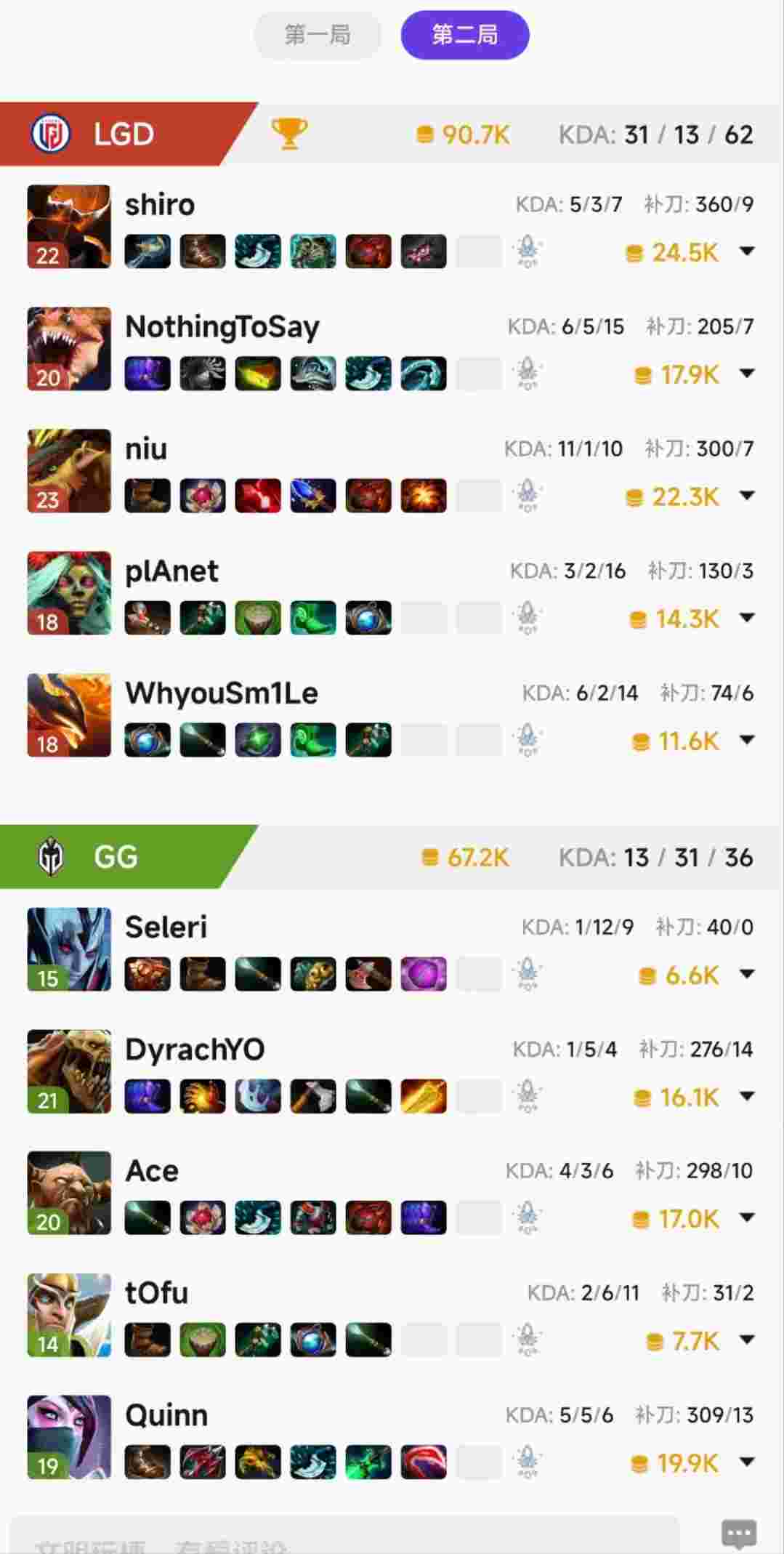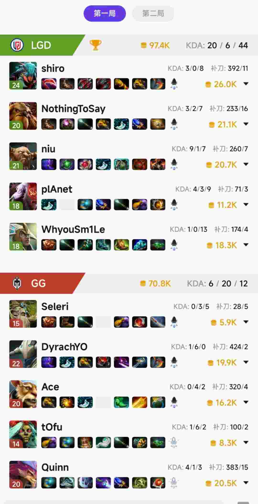 首局比赛LGD对线打出两路优,中路ccnc滚滚还是略微压制了NTS牛头!但是dyrachyo斯温状态低迷几次白给!中期NTS牛头利用GG打魔方时机隐身来了个核弹大!LGD拿下一代肉山之后GG想反击,但是又是dyrachyo斯温白给让LGD掌握局势主动权,LGD随后稳扎稳打,拿下二代肉山之后团战两次逮捕Ace酒仙,推掉两路高地之后shiro蚂蚁进场无人可挡,NTS牛头和niu人马控制拉满,打出1换3之后直接基地拿下首局比赛!