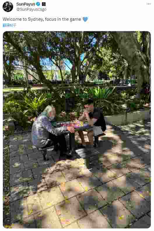 Alvaro Garcia | SunPayus在12日经过24小时的旅程抵达悉尼后,经过两日的调整,似乎身体状态已经有所好转,今日早些时候,SunPayus发表了一条新的动态,照片中显示,太阳神正在悉尼街头与一公园老头对弈。