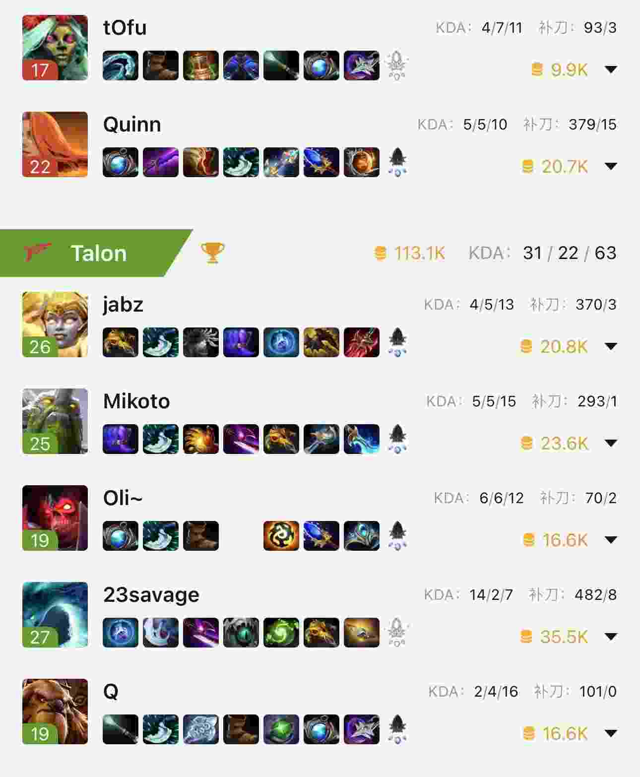 Talon的阵容搭配非常的合理,中单Mikoto是东南亚最强的中单之一,和NothingToSay号称东南亚中单双子星。在此前和世界顶尖中单Nisha交手的比赛中,Mikoto曾多次占据上风,这是Talon中期进攻节奏的保障。一号位23Savge克服心魔涅槃重生,从小丑水人到变体大魔王,可以说心理素质非常强大。在这个依靠一号位终结比赛的版本里,23Savge可以一展拳脚!三号位jabz英雄池很深,版本强势的锤妹、钢背兽、白牛都玩得很好,在BP方面很难被针对,让Talon可以选出非常灵活的阵容体系。四号位Q博士是高配版FY,在这个辅助非常有钱的版本,Q博士的舞台很大,他可以选择一些在后期有巨大作用的辅助,比如A杖海民就让GG非常头痛。Oli~作为曾经在中国赛区效力的五号位,观众们对他耳熟能详,稳健的老将很少犯错,视野把控老练毒辣,和23Savge磨合的非常好。这么看这支Talon真的非常有实力,中国战队需要小心!