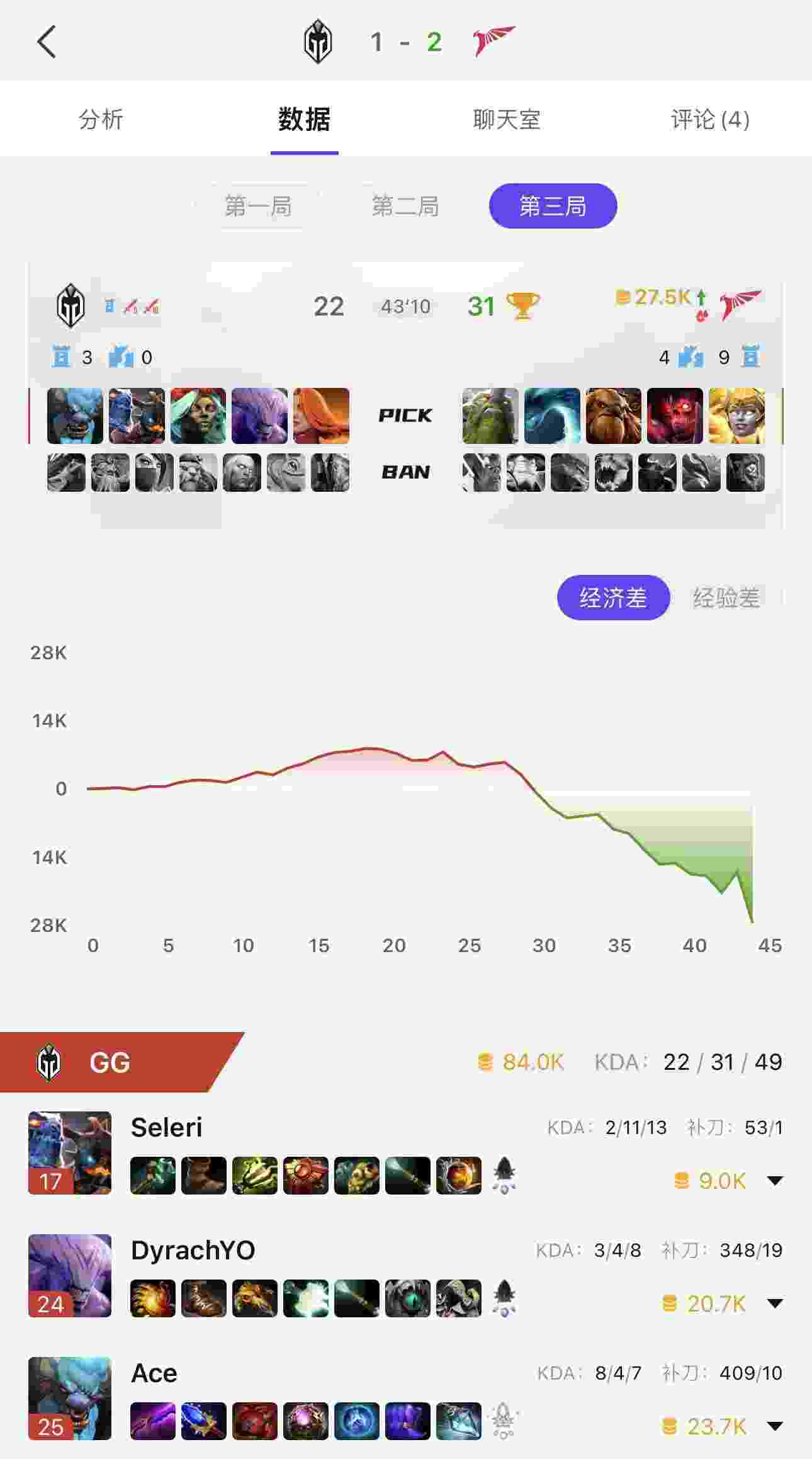 值得一提的是,在对阵Talon的第三局比赛中,GG.Ace操刀的白牛在20分钟的净资产为12888,这个数字打破了自TI5以来的最高记录,可惜最后还是输了。