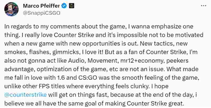 “关于我先前的评论,我想强调一点:我很爱CS。每当有新游戏和新机遇,你很难不会兴奋。新战术、新烟雾弹、新闪光弹等等,我都很喜欢!但作为CS的粉丝,我也不能忽视现在的问题:声音、移动、MR12和经济系统、主动peek优势,还有游戏优化问题。让我爱上CS1.6和CS:GO的原因是它们流畅的游戏体验,不像其他FPS游戏一样僵硬。我希望官方能尽快修复这些问题,因为归根到底,我相信大家都有一个共同目标——让CS变得伟大。”