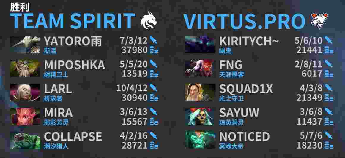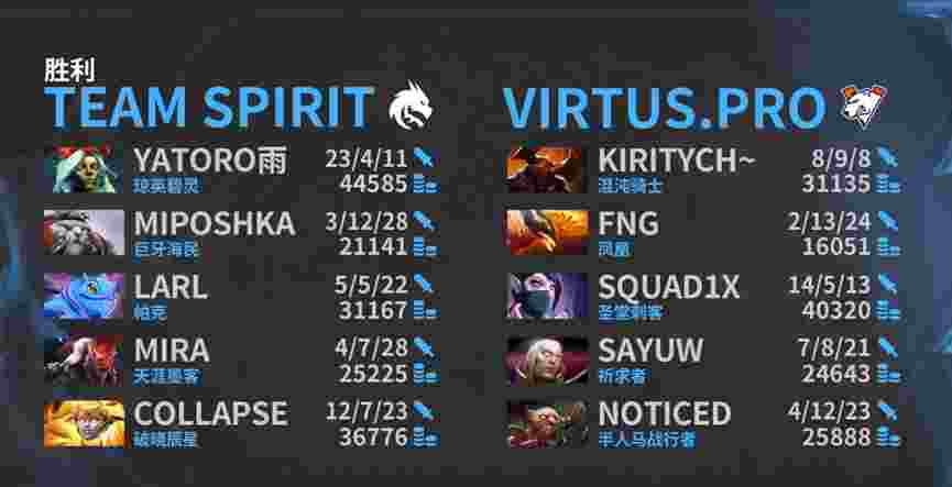 2023年国际邀请赛之路淘汰赛,Spirit 2-1战胜了VP。Spirit晋级胜者组,将在下一场对阵Liquid和Talon的胜者,VP掉入败者组,将在下一场对阵Tundra和Entity的胜者。