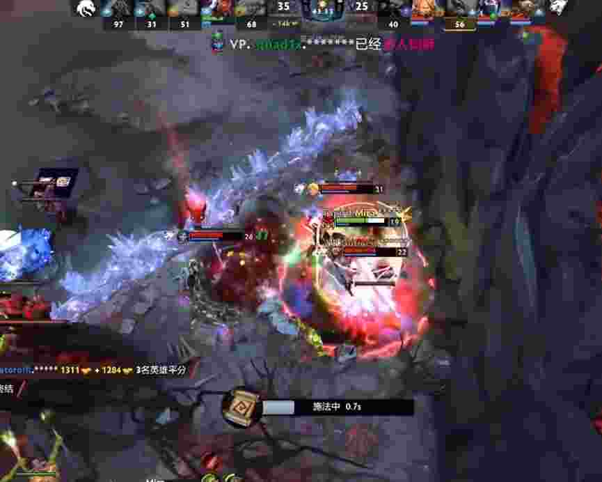 20分钟VP开雾抓人,在上路抓到大锤海民后打盾,帕克迟迟赶到,犹豫了一下大晚了0.1秒结果一个也没大到,全让VP跑了。