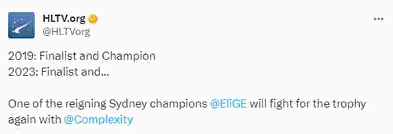 “2019年闯进决赛并获得冠军,2023年挺进决赛又会如何呢,EliGE这次将带领Complexity全队一起再次为IEM悉尼冠军奖杯而战!”