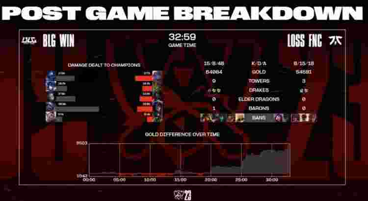 最后一波,野区交战,BLG先集火秒掉了Trymbi牛头,随后绕后TP的Humanoid阿卡丽被围追,Bin贾克斯后排一打三配合队友留住了Oscarinin波比,BLG打出0换2想一波了!BLG在门牙塔处直接秒掉了Noah的卡莎!FNC没有战力了,只能看着BLG推掉基地水晶!
