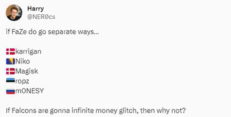 “如果FaZe分崩离析,如果Falcons无限刷钱,这套阵容为什么没可能呢?”