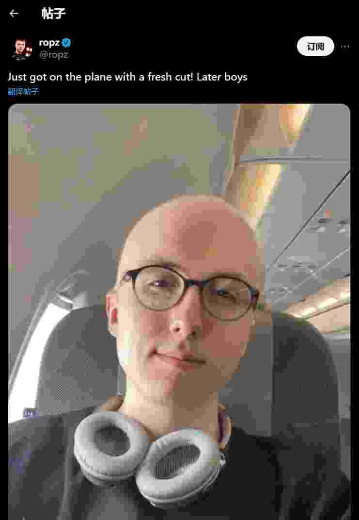 日前ropz在个人推特上发布了一张照片,照片中的他剃了光头,带着黑框眼镜,显得儒雅随和。ropz还写道:带着新发型登机了。