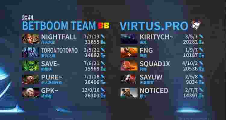 第一局前期squad1x火女对线猛压卡尔,但是两条边线BB都拿到了优势!中期Nightfall大圣几波支援帮助中单解围,还借助Pure人马带队扫图和视野压制不断击杀squad1x火女,BB稳扎稳打拿下肉山,团战不断获胜拉开经济差!巨大的装备差之下VP的伤害根本不够!BB推掉三路高地,VP肉山团绝命反扑失败之后敲出GG,BB拿下首局!